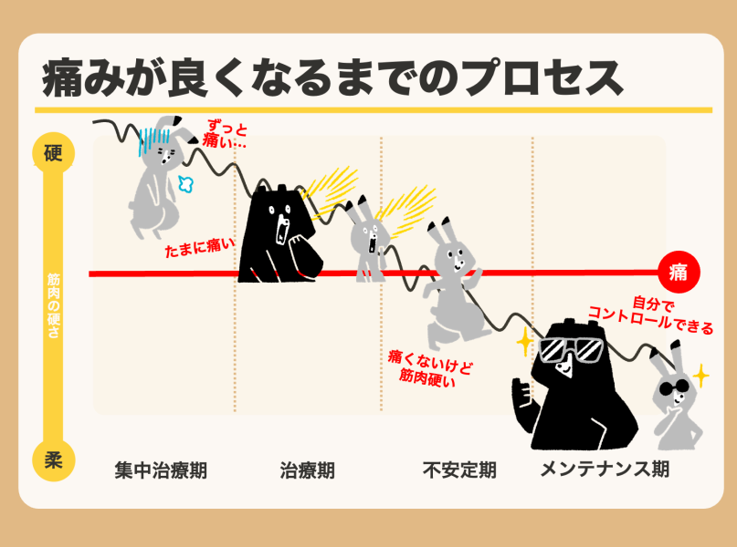 整体院での施術やセルフケアを通して、痛みは次の4つのフェーズで改善していきます。